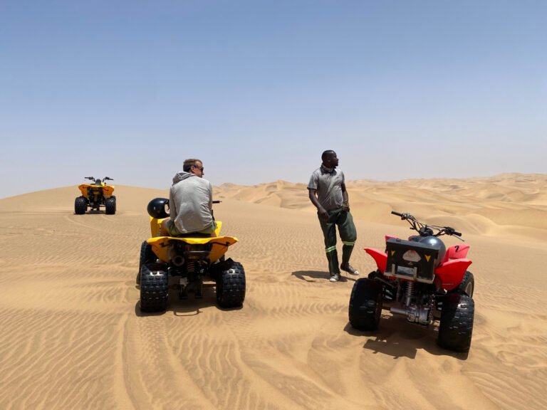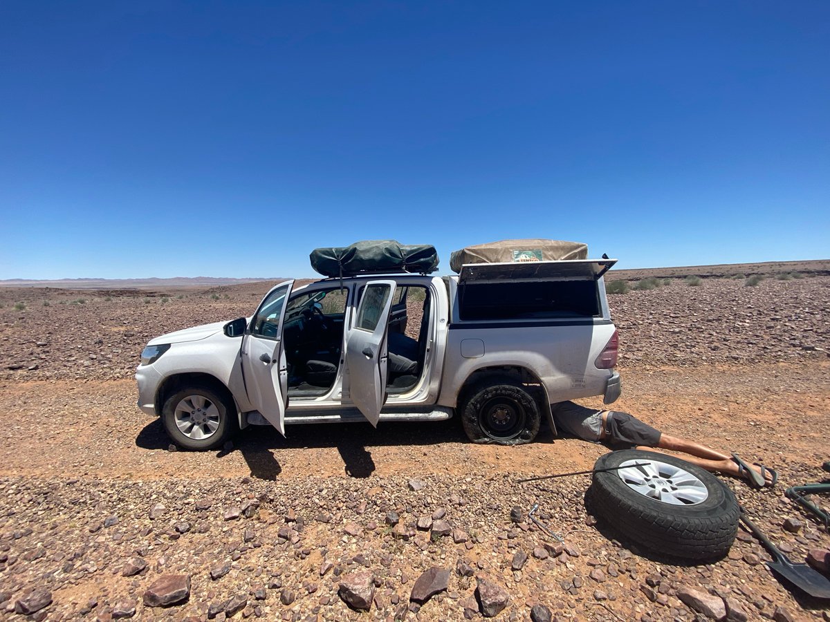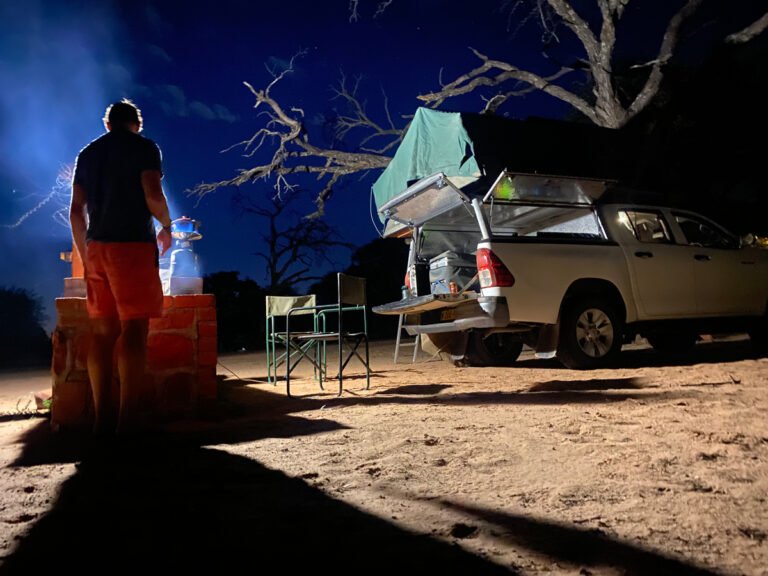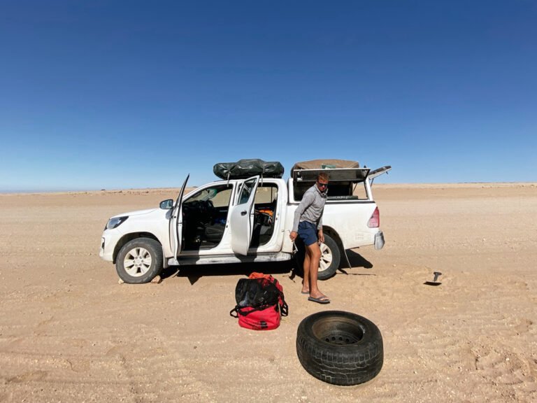 Windhoek is a strange mix of colonial German architecture, wide-open African skies, and a laid-back vibe that belies the fact it’s the largest city in a country twice the size of California. We spent three days here adjusting to the heat, organizing gear, and renting the ultimate safari-mobile: a white 4×4 pickup truck with two rooftop tents, a mini-fridge, a cooking kit, and not one, not two, but three spare tires. (We used them all.)