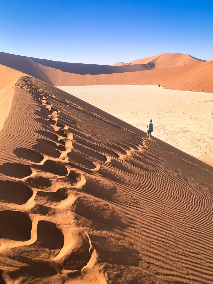 Next stop: the towering red dunes of Sossusvlei, some of which rise over 1,000 feet and glow like fire in the early morning sun. We hiked them barefoot, slid down them like kids, and snapped some of the most surreal landscape shots of our lives.