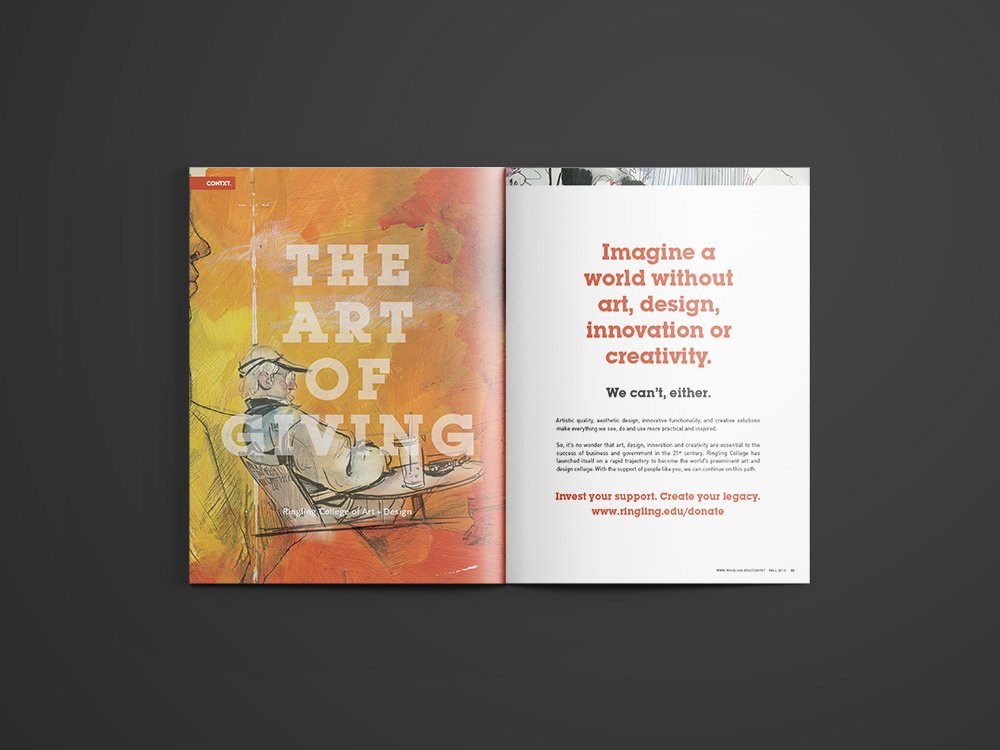 During my seven-year tenure as a senior-level designer at the Ringling College Design Center, I served as lead designer and art director for CONTXT Magazine, the college’s flagship publication. Working alongside two creative directors, a small team of designers and production coordinators, and a select group of talented student interns, I was responsible for the magazine’s full design direction — including layout, typography, photography, and, at times, copy-editing.