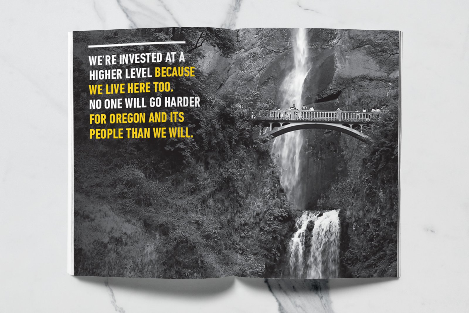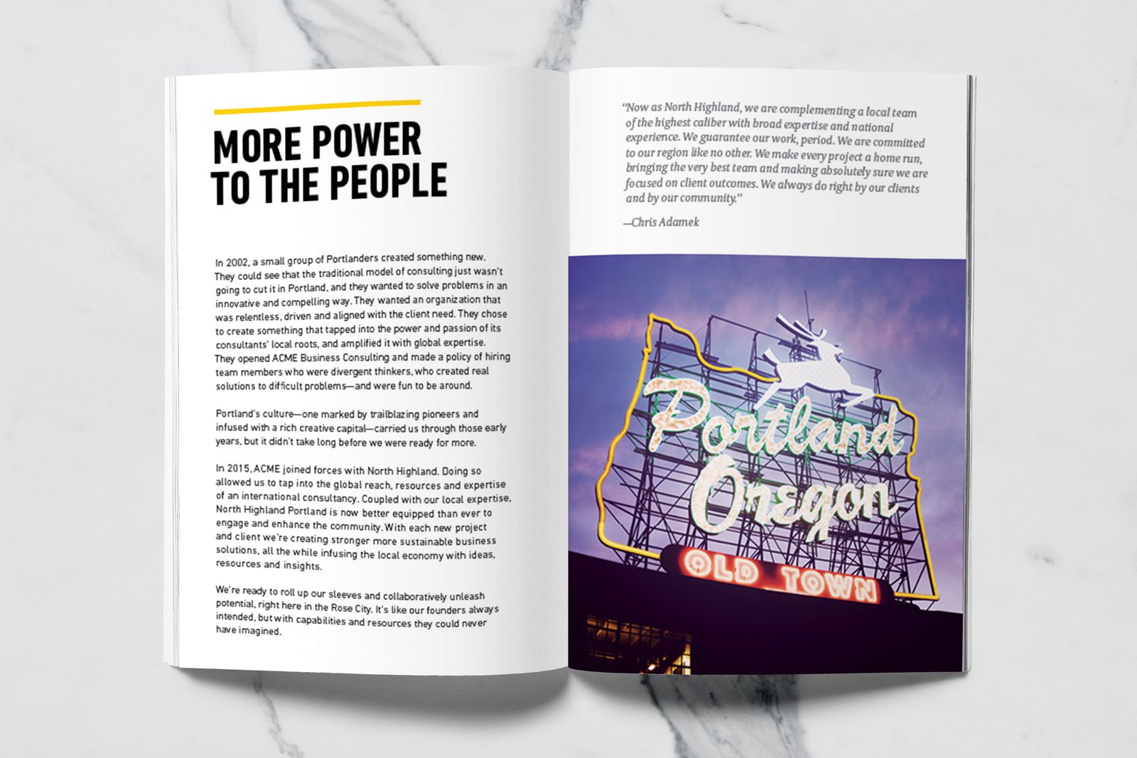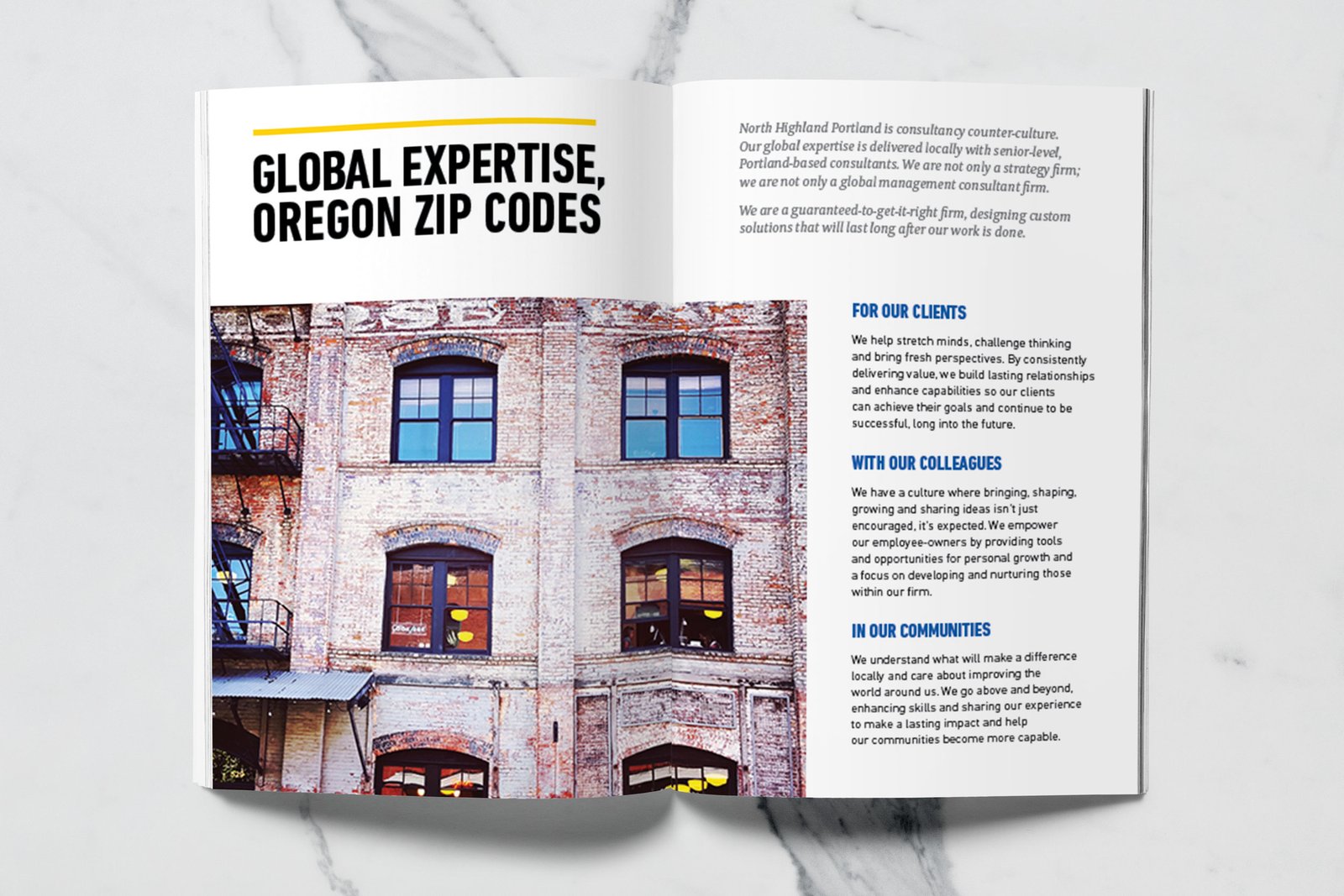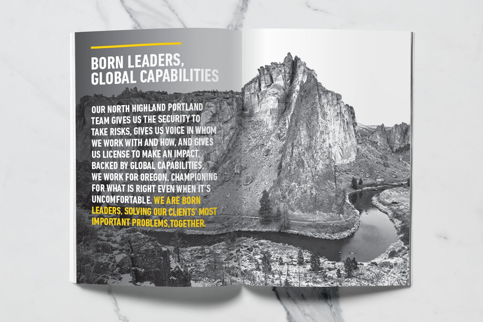 North Highland, a global consulting firm with a Portland office, wanted to create a premium printed lookbook that captured the spirit of Oregon’s business community — rugged, creative, and unafraid to forge new paths. The firm works with Portland’s top business leaders to solve critical challenges across diverse industries, and they needed a piece that embodied that same energy: industrious yet sophisticated, bold yet authentic.