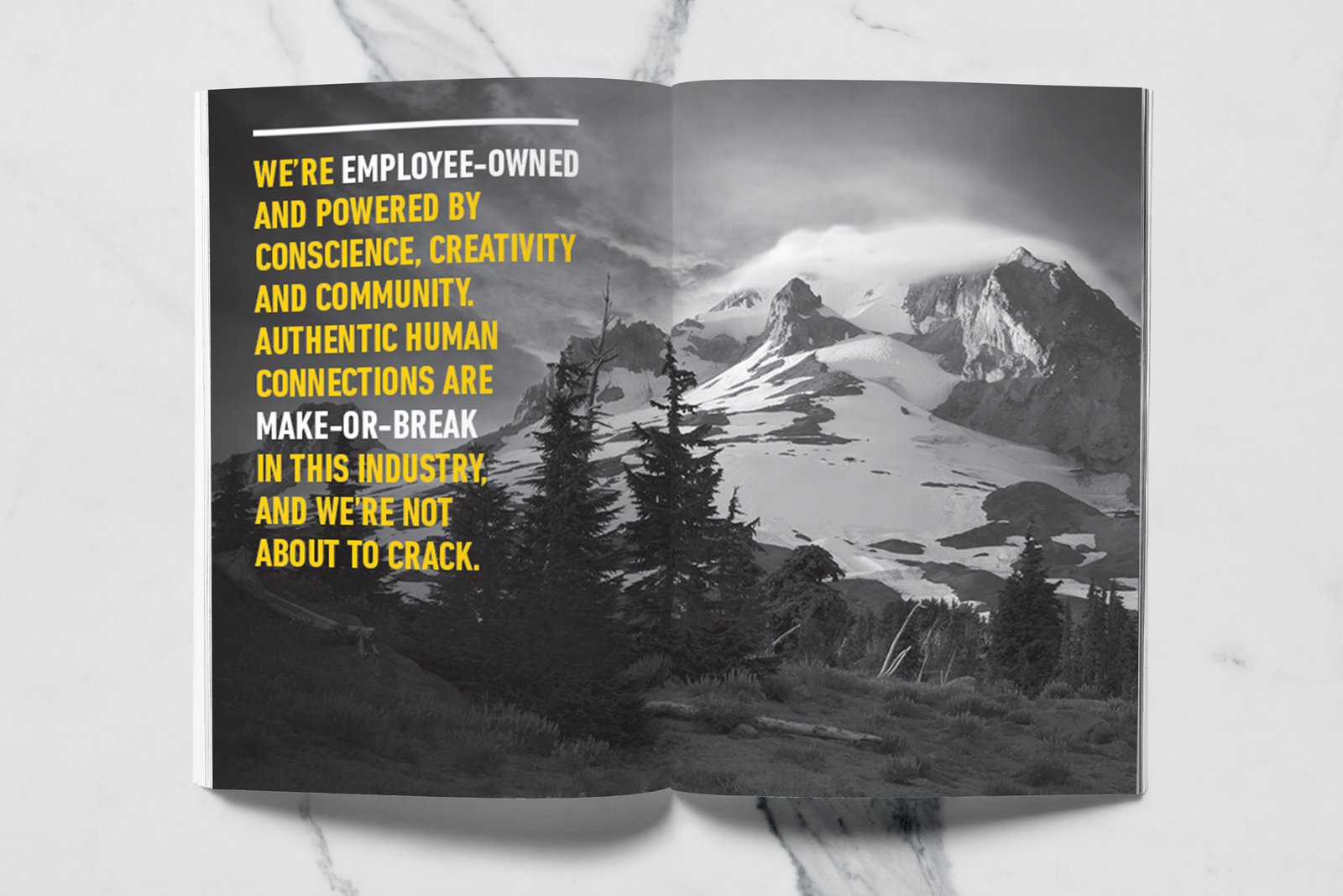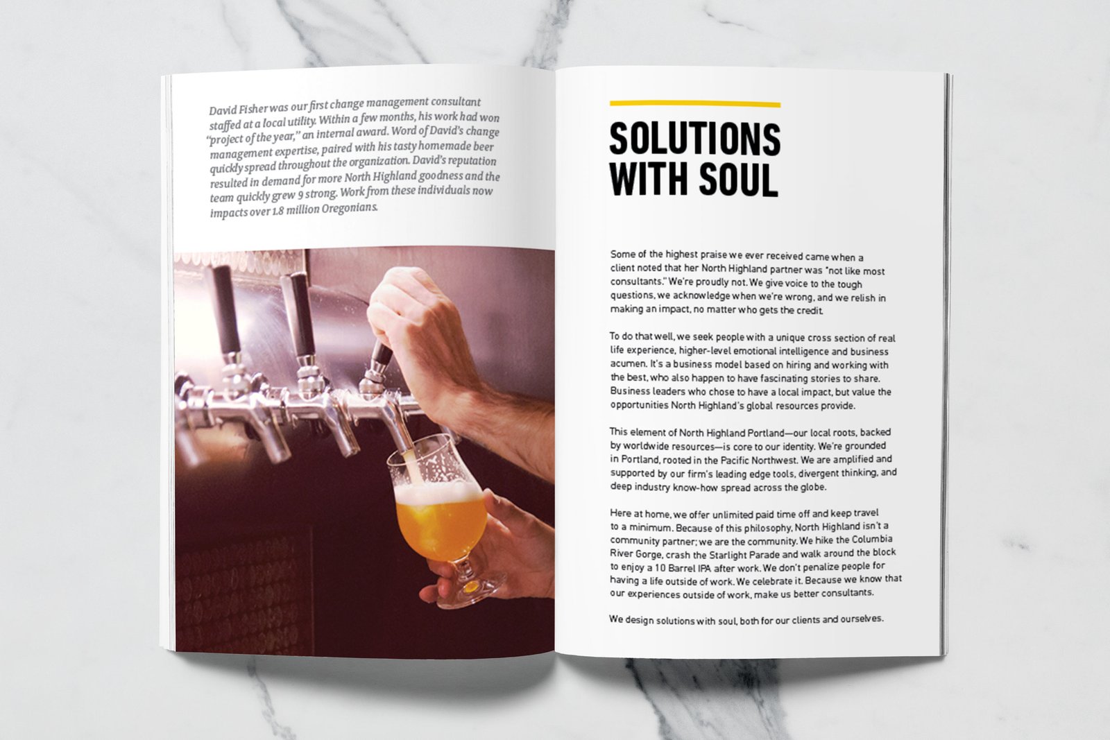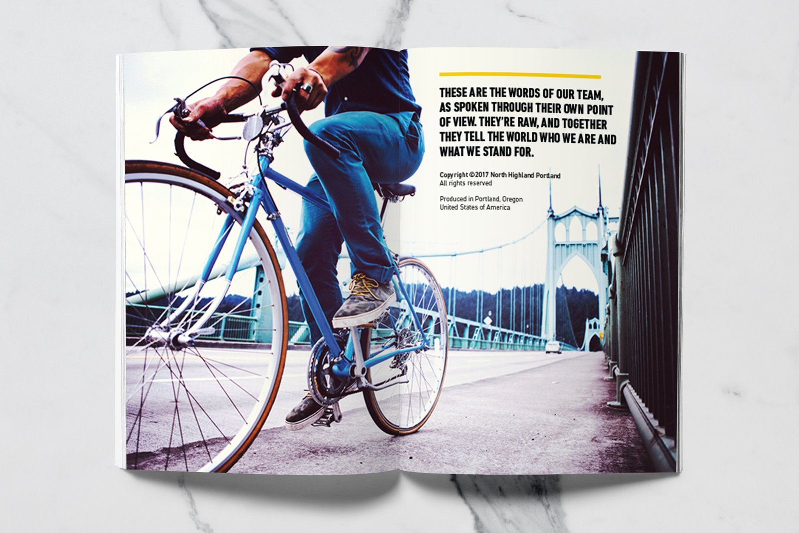 North Highland, a global consulting firm with a Portland office, wanted to create a premium printed lookbook that captured the spirit of Oregon’s business community — rugged, creative, and unafraid to forge new paths. The firm works with Portland’s top business leaders to solve critical challenges across diverse industries, and they needed a piece that embodied that same energy: industrious yet sophisticated, bold yet authentic.